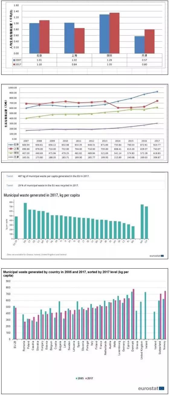 人均生活垃圾量是多是少,如何評價。有人說少好,少說明減量化做的好。看歐盟28個國家生活垃圾量統計,人均量多的國家往往生活垃圾管理水平高,生活垃圾回收利用利用率也高,如2017年歐洲生活垃圾量統計數據:丹麥748千克/人·年,瑞士706千克/人·年,德國633千克/人·年;人均生活垃圾量少的國家往往經濟水平低,生活垃圾回收率低,如羅馬尼亞272千克/人·年,塞爾維亞306千克/人·年;2017年瑞士生活垃圾回收利用率為53%,丹麥為48%,而羅馬尼亞只有13%。