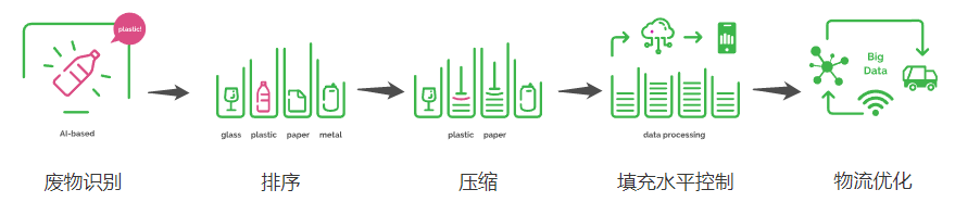 2)系統配備的感應壓縮桿在垃圾容量對紙類和塑料類垃圾進行智能壓縮,以提升可丟棄垃圾的容量,降低單位垃圾收運成本;