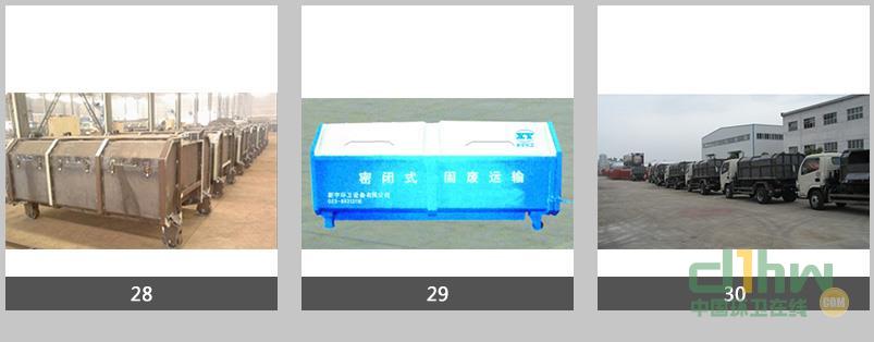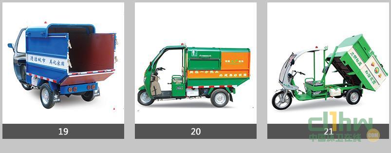 | 壓縮式垃圾車 | 車廂可卸式垃圾車 | 自裝卸掛桶垃圾車 | 擺臂式垃圾車 | 密封式垃圾車 | 桶裝垃圾運輸車 | 吊裝式垃圾運輸車 | 餐廚垃圾車 | 醫療廢物收運車 | 人力三輪垃圾車 | 手推垃圾車 |