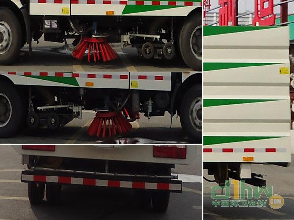 兩側裝有專用作業裝置,后防護材料為Q235,連接方式:用結構連接件固焊在主車后端;.后部防護裝置斷面尺寸(寬×高)60×120(mm).后部防護離地高度:430(mm).隨底盤選裝駕駛室.選裝側部兩掃盤裝置及后部吸盤裝置.ABS型號為3631010-C2000,生產廠家為東科克諾爾商用車制動系統(十堰)有限公司.