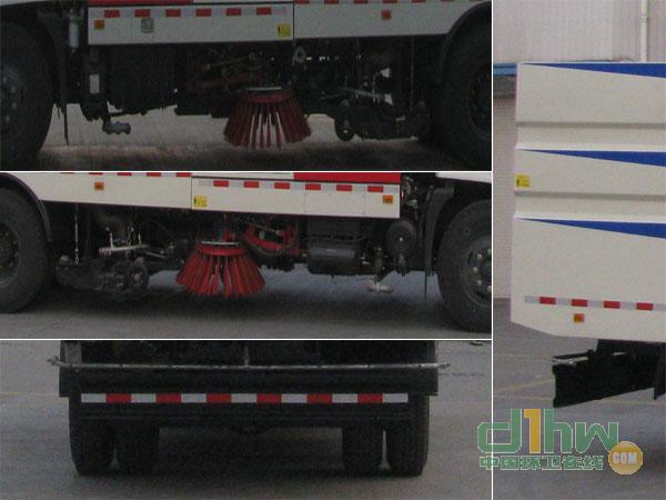 該車承擔城區主干路的沖洗、清掃作業的車輛,專用裝置為車輛中置刷盤或吸塵裝置.選裝軸距之間兩掃盤裝置及正后結構.選裝軸距之間兩掃盤裝置及正后結構時引起整備質量參數的變化在3%范圍內.選裝軸距之間兩掃盤裝置及正后結構對該車作業功能無影響.左右兩側防護專用裝置代替.后防護材料為Q235,連接方式:用結構連接件固焊在主車后端,后部防護裝置斷面尺寸(寬×高)50×300(mm),后部防護離地高度:440(mm).隨底盤選裝駕駛室.裝有具有衛星定位的行車記錄儀.ABS型號:3631010-C2000,4460046440;生產廠家:東科克諾爾商用車制動系統(十堰)有限公司,威伯科汽車控制系統(中國)有限公司.僅采用4500(mm),4700(mm),5000(mm)軸距底盤.
