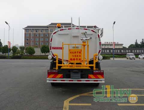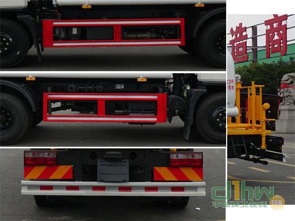 該車主要用于城鄉園林綠化灑水;主要裝置為水罐及泵.運輸介質為:水,密度:1000千克/立方米.罐體有效容積10.08立方米.罐體外形尺寸(長×長軸×短軸)(mm)4200×2250×1550.側防護材料為Q235,連接方式為連接支架固焊在副車架大梁上.后防護材料為Q235,連接方式:用結構連接件固焊在主車后端,后部防護裝置斷面尺寸(寬×高)40×120(mm),后部防護離地高度:450(mm).隨底盤選裝駕駛室.裝有具有衛星定位的行車記錄儀.ABS型號為:3631010-C2000,生產廠家為:東科克諾爾商用車制動系統(十堰)有限公司.僅采用3950(mm)軸距底盤.