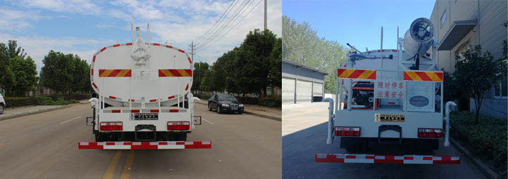 該車主要用于城鄉園林綠化灑水,噴藥等;主要裝置為水罐及泵.隨底盤選裝駕駛室.罐體有效容積:11立方米,整車長/后懸/軸距/罐體外形尺寸(長×長軸×短軸)(mm)對應關系為: 7400/2220/3950/4250×2350×1460,后部不帶風機; 7800/2620/3950/4000×2400×1520,該尺寸后部安裝風機;8000/2270/4500/4950×2200×1370,后部不帶風機;8550/2820/4500/4800×2350×1350,該尺寸后部安裝風機.側/后防護材料為Q235B,螺栓連接;后部防護裝置斷面尺寸(寬×高)50×120(mm),后部防護離地高度:490mm.ABS系統生產廠家,型號 :焦作博瑞克控制技術有限公司,J ABS.可選裝外觀樣式,選裝風機樣式.