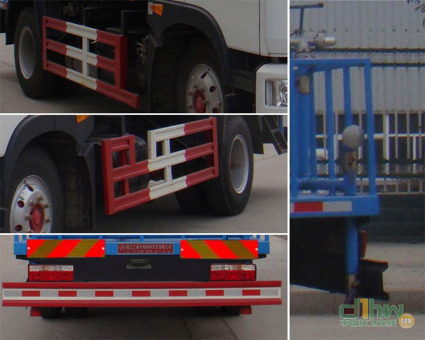 選裝側噴,尾部農藥炮;介質:水;密度:1000千克/立方米;罐體有效容積9.7立方米;尺寸對應關系(mm):外形尺寸長/軸距/后懸/罐體外形尺寸(長×長軸×短軸):7700/3950/2520/4100×2300×1500,8200/4500/2470/4600×2200×1350;ABS的型號:J ABS,生產廠家:焦作博瑞克控制技術有限公司;側面防護及后下部防護裝置材料材質:Q235,側面防護裝置連接方式:焊接加螺栓連接;后下部防護裝置斷面尺寸(寬×高):30×200(mm),后下部防護裝置離地高度:500mm.