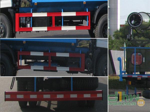 運輸介質為:抑塵劑,密度:780千克/立方米.罐體有效容積9.82立方米.當軸距為4700(mm)時,罐體外形尺寸(長度×長軸×軸)(mm):4200×2250×1500.當軸距為4500(mm)時,罐體外形尺寸(長度×長軸×軸)(mm):4000×2250×1550.當軸距為3950(mm)時,罐體外形尺寸(長度×長軸×軸)(mm):3500×2300×1600.防護材料:Q235碳鋼,連接方式:左右側面及后下部防護均采用焊接連接,后部防護裝置斷面尺寸(寬×高)60×120(mm),后部防護離地高度(mm):450(mm).裝有具有衛星定位的行車記錄儀.ABS型號:3631010-C2000,4460046440;生產廠家:東科克諾爾商用車制動系統(十堰)有限公司,威伯科汽車控制系統(中國)有限公司.隨底盤選裝駕駛室前臉擾流罩.選裝側部結構及罐體前部平臺.僅采用3950(mm),4500(mm),4700(mm)軸距底盤.