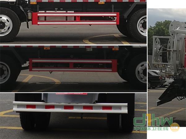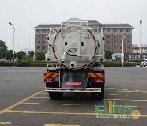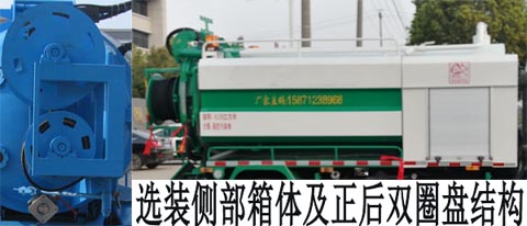 該車專用裝置為水罐和吸污罐,主要用于城市管網的清洗和疏通.吸污罐運輸介質:液態污染物,密度:800千克/立方米,載質量:4200(kg),吸污罐罐體有效容積5.51立方米.罐體尺寸(長(mm)×直徑(mm):4200×1400.清水箱運輸介質:水,密度:1000千克/立方米,載質量:900(kg),容積0.94立方米,清水箱截面為圓弧及多邊形組成,截面積為0.14平方米,清水箱外形長(mm)為:3800.兩個罐體不能同時滿載.側防護材料為Q235,連接方式為連接支架固焊在副車架大梁上.后防護材料為Q235,連接方式:用結構連接件固焊在主車后端,后部防護裝置斷面尺寸(寬×高)40×120(mm),后部防護離地高度:420(mm).選裝后部雙圈盤結構及側部結構.選裝單排帶臥鋪,選裝前圍及前部燈具.ABS型號:44600XXXX0;ABS生產企業:威伯科汽車控制系統(中國)有限公司.安裝具有衛星定位功能的行駛記錄儀.