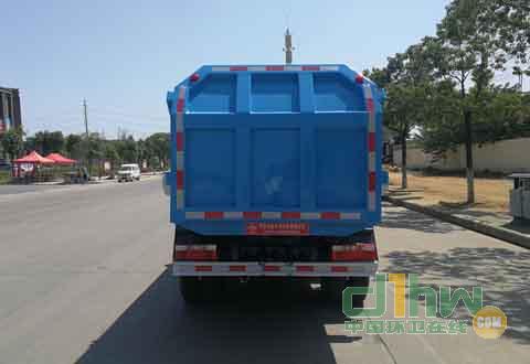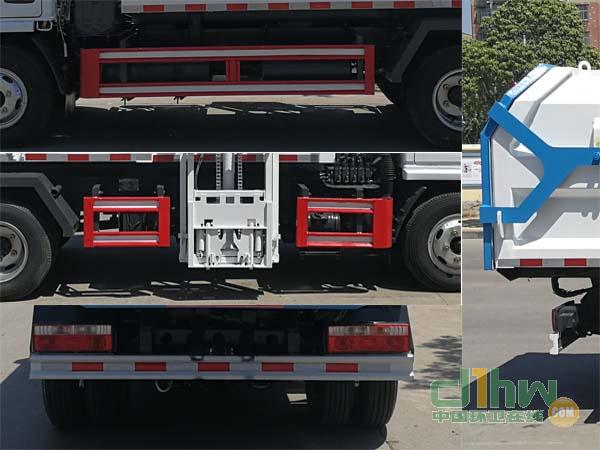 1,防護材料:Q235A碳鋼,連接方式:左右側面及后下部防護均采用焊接連接,后下部防護斷面尺寸(mm):150×50,后下部防護離地高度(mm):480。2,整車長/軸距對應關系為(mm):6365/3800,6165/3600,5865/3300;軸距變化引起的質量變化在3%內。3,發動機與油耗值對關系為(L/km): YC4FA110-50/17.9, 4DX23-140E5/18.0。4,ABS系統控制器型號: 3631010-C2000,ABS系統控制器生產廠家: 東科克諾爾商用車制動系統(十堰)有限公司。5,隨底盤選裝駕駛室。6,專用裝置:掛桶機構,主要用于城鎮環衛桶裝生活垃圾的收集與運輸。