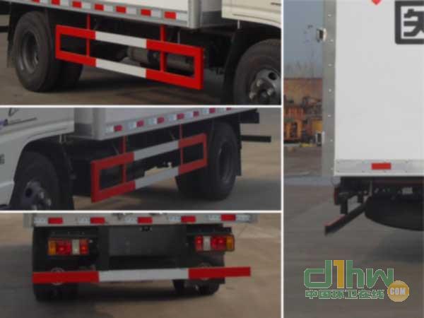 隨底盤選裝駕駛室;廂體頂部封閉,不可開啟;選裝其它廠家功率相當的制冷機組;選裝側門及側門位置;選裝液壓升降尾板(收起狀態水平長度為290mm);運輸介質:感染性物質,診斷樣品,醫院診斷廢棄物,類項號:6.2,6.2,6.2;該車為危險品貨物運輸車;僅采用前輪盤式制動器,前置排氣管,子午線輪胎,限速裝置的底盤,限速80km/h;該車安裝具有衛星定位功能的行駛記錄儀;所有發動機對應油耗值均為11.9L/100km;ABS系統型號:APG3550500A,ABS系統生產廠家:浙江亞太機電股份有限公司;側面防護及后下部防護裝置材料材質:Q235,連接方式:焊接加螺栓連接;后下部防護裝置斷面尺寸(寬×高):50×100(mm),離地高度:450mm.