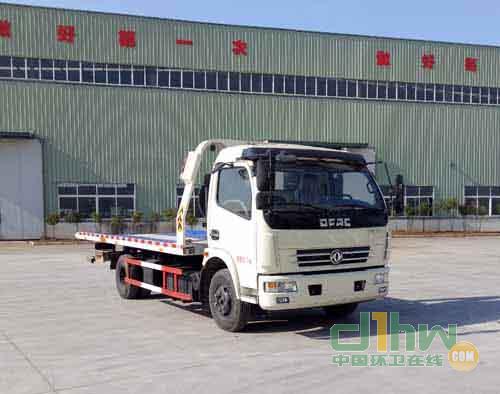 隨底盤選裝駕駛室; 后伸110mm;托舉質量:3200kg;側防護冷彎型鋼/Q235,螺栓連接;后防護由專用裝置替代,下邊緣離地高470mm; ABS型號:ABS/ASR-24V-4S/4M,廠家:襄陽東風隆誠機械有限責任公司; 僅用7.50R16 16PR輪胎.選裝擺臂平板裝置和后攔板,該車主要用來托運道路故障車輛和城市違章車輛,主要專用裝置為平板、油缸和取力器等.