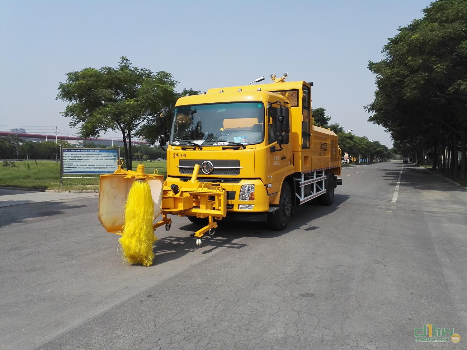 該車在側部及后部粘貼反光標識;該車為專用作業車,側下部防護裝置采用Q235普通鋼材制作并與車架大梁、上裝采用螺栓連接,后防護離地高度為500mm。前伸200mm。ABS型號:3631010-C2000,生產廠家:東風電子科技股份有限公司制動系統分公司。可選裝1:護欄清洗機,前伸:1600mm,整車尺寸:10590×2496×3930,整備質量:12000kg,額定載質量:3605kg:可選裝2:輔助支撐輪,整備質量:11950kg,額定載質量:3655kg.
