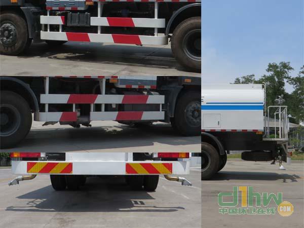 車輛主要裝有墻面清洗裝置,水罐體,低壓灑水噴嘴,后作業平臺等專用裝置,主要用于高架橋橋身,城市道路中間護欄,城市高速路隔音墻,隧道墻面或建筑外墻面的清洗.僅選用4500mm軸距.前伸為2315mm.隨底盤選裝前臉擾流罩,選裝前霧燈,選裝駕駛室頂部裝飾燈,選裝臥鋪側窗裝飾板.后部選裝圓形噴嘴.安裝ABS,ABS型號:3631010-C2000,4460046440;生產廠家:東科克諾爾商用車制動系統(十堰)有限公司,威伯科汽車控制系統(中國)有限公司.車輛側面防護裝置的材料材質為鋁合金,后下部防護裝置的材料材質為Q235鋼,連接方式均為螺栓連接.后下部防護裝置的斷面尺寸(mm)為65×175,最大離地高度為490mm.