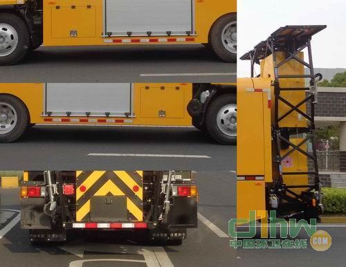 該車安裝有防撞緩沖專項作業裝置及導向標志顯示裝置(液晶顯示屏導向指示)。左右側防護對稱安裝,側防裝置材料為Q235A,與汽車大梁用螺栓連接。后防裝置材料為Q235A,后防護與專用裝置焊接連