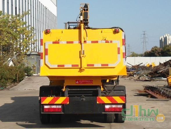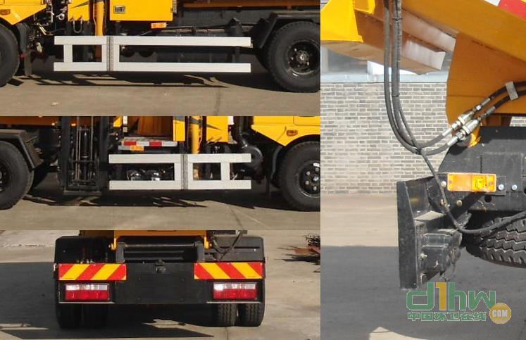 1.頂部除進料口外其他部分封閉,不可開啟;2.自卸方式:后卸式;該車通過提升機構將污泥桶,提升到一定高度通過翻轉軸實現翻轉卸泥,使污泥卸至車廂內,通過油缸將車廂舉升至一定高度,開啟后門,將污泥卸出;3.側面防護裝置和后下部防護裝置材料為Q235A,與車輛的連接方式均為螺栓連接,后下部防護斷面尺寸為100×50(mm),最大離地高度500mm;4.ABS型號:VIE ABS-II