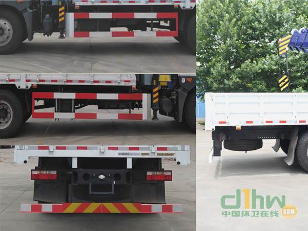 隨底盤選裝前面罩,前保險杠,前組合燈具以及前霧燈. 隨底盤安裝ABS,ABS系統生產廠家,型號:焦作博瑞克控制技術有限公司,J ABS.安裝具有衛星定位功能的行駛記錄儀。側防護:材質Q235,連接方式:螺栓連接.后下防護:材質Q235.連接方式:螺栓連接.斷面尺寸120×60mm,離地高度390mm;隨車起重機型號/隨車起重機質量(kg)/最大起升載荷(kg)分別為:SKMS6.3S3K/2780/6300;選用YC4EG170-50、ISD160 50發動機對應的油耗值(L/100km)為26.0,26.3;選裝貨箱風格。