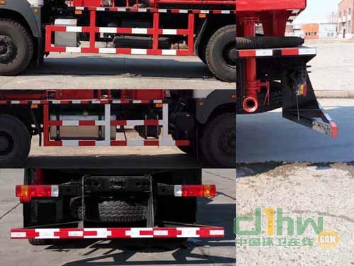 該車所用底盤軸距為4800+1350(mm)。ABS防抱死制動系統生產廠家:長春科密汽車制動有限公司,型號:CM4XL 。側后防護裝置材料:Q235;連接方式:螺栓連接;后防護斷面尺寸100mm×50mm,后防護離地高度為550mm。