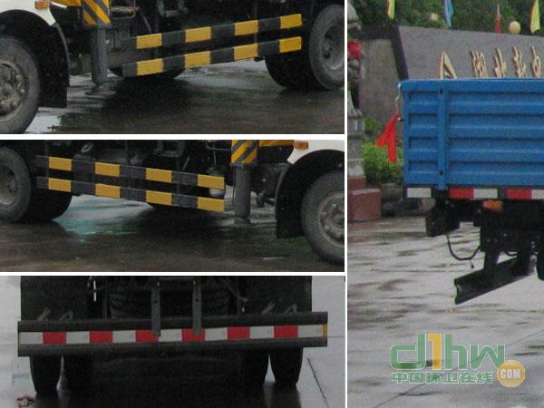 該車上裝選裝折臂式吊機;吊機型號,質量,最大起升載荷,整備質量,額定載質量分別對應為:SQ3.2S:1150Kg/3200Kg/4850Kg/3230Kg;SQ3.2Z:1080Kg/3200Kg/4780Kg/3300Kg;后防護材料為Q235,連接方式:用結構連接件固焊在主車后端,后部防護裝置斷面尺寸(寬×高)60×120(mm),后部防護離地高度:400(mm).隨底盤選裝駕駛室.ABS型號:ABS/ASR-24V-4S/4M,廠家:襄陽東風隆誠機械有限責任公司.
