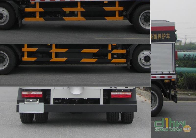 該車專用功能為路面養護作業,專用裝置為前部噴頭裝置,廂體;外形長和軸距一一對應:4950/2700,4620/2370;裝ABS,ABS控制方式為4S/4M,ABS系統控制器型號是CM4YL,ABS系統控制器生產企業是廣州瑞立科密汽車電子股份有限公司.隨底盤選裝駕駛室.