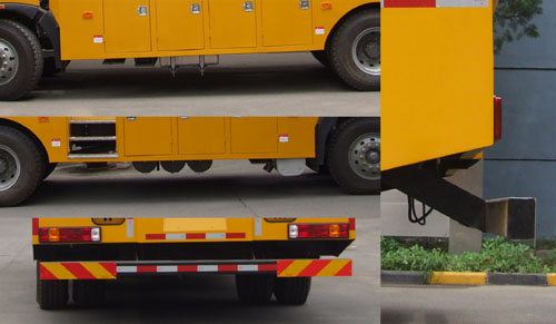 當整車長8600mm時,前伸200mm,后伸1120mm;當整車長8420mm時,前伸960mmm,后伸180mm;當整車長7680mm時,前伸400mm.選裝無吊鉤裝置和密封吊籃。側面防護及后下部防護裝置材料:碳鋼/Q235B,側面防護連接方式:螺栓加焊接連接,后下部防護連接方式:螺栓加焊接連接,斷面尺寸(寬×高):50×120(mm),離地高度:450mm.ABS及其控制器型號為:APG3550500A4,生產廠家為:浙江亞太機電股份有限公司。