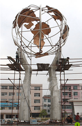 不銹鋼雕塑——托起希望。設計理念:以雙手高高托起地球的抽象造型進行創作,寓意托起希望、托起未來。安裝地點:龍山縣一中