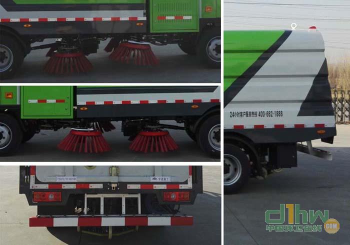 掃路車“中置四盤刷,后置吸嘴”結構布置,副發動機驅動風機及其工作裝置,以吸為主,洗掃結合,濕式除塵,對路面進行清掃作業,采用電液操縱控制,液壓傾翻卸料,具有清掃能力強,清掃寬度大,清掃速度高,吸入粒大,可靠性高,易于操作和維護,作業效率高等特點。
