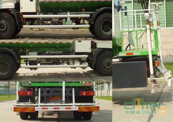 采用自吸式雙級離心泵,效率高,揚程大,水泵由底盤發動機取力傳動;自吸管路采用了專門的快速接頭及止回閥,自吸高度6.5m,水平自吸距離>10米(選配);具有新穎的前沖(水)、后灑(水)功能,前后采用不同特點的噴嘴,后噴嘴適應于灑水降溫,前噴嘴沖洗壓力大,可一次沖洗6條車道;前沖洗嘴由電、氣控制,操作方便靈活;水罐容積大,工作時間長;具有噴霧降塵功能;具有輔助消防功能、自吸功能(選配);可選裝綠化澆灌功能。
