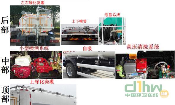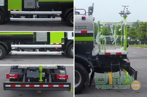 1.該車裝有水罐、水路系統、后作業平臺、控制系統,用于清洗作業;該車前伸為375mm;罐體外形尺寸(長軸×短軸×長度)(mm):2000×1050×2500,罐體有效容積3.57立方米.側防護裝置材料為鋁合金,連接方式為螺栓連接;后防護裝置材料為Q235A,連接方式為螺栓連接.后部防護裝置的斷面尺寸為240×60mm;離地高度為390mm.該車可選裝左右綠化澆灌;上下噴霧;卷盤;小型噴灑系統;自吸;上綠化澆灌;高壓清洗系統,該系列選裝對于整車尺寸,重量變化可忽略不計;2.該車技術階段為"發展期",可在全國銷售,隨底盤裝ABS,ABS型號為:VIE ABS-Ⅱ,生產企業為:浙江萬安科技股份有限公司;3.磷酸鐵鋰電池,型號:1AL0H2,生產企業為寧德時代新能源科技股份有限公司;4.驅動電機類型為永磁同步電機,型號為TZ360XSC2S01,額定功率為100kw,峰值功率為200kw,5.整車控制器型號為VCU17-U62,生產企業為上汽大通汽車有限公司/聯合汽車電子有限公司.