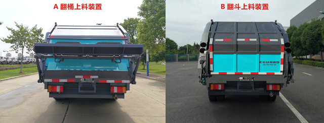 選用3500mm軸距底盤,裝有ABS,型號:DETC-ABS-4S/4M;生產廠家:東風電子科技股份有限公司汽車制動系統公司;該車后部有2種配置:A(翻桶上料裝置),B(翻斗上料裝置);配置A時,整車長7135mm,后伸310mm,后懸2175mm;配置B時,整車長6985mm,后伸230mm,后懸2105mm;動力蓄電池種類為三元鋰蓄電池,生產企業為桑頓新能源科技有限公司,驅動電機類型為永磁同步電機,型號為TZ290XS065M0701,額定功率為65kW,峰值功率為110kW,生產企業為湖南意譜電動系統有限公司;電機控制器型號為KTZ37X40S10C,生產企業為湖南意譜電動系統有限公司;側面防護裝置由電池罩和防護欄組成,防護欄材質為鋁合金,連接方式為螺栓連接,后部防護由專用裝置替代,離地高度為485mm.專用裝置由垃圾箱、液壓機構、填裝器等組成,專用功能:將垃圾自行壓實裝入,轉運和卸料作業.產品技術階段:發展期;銷售區域:可全國銷售.
