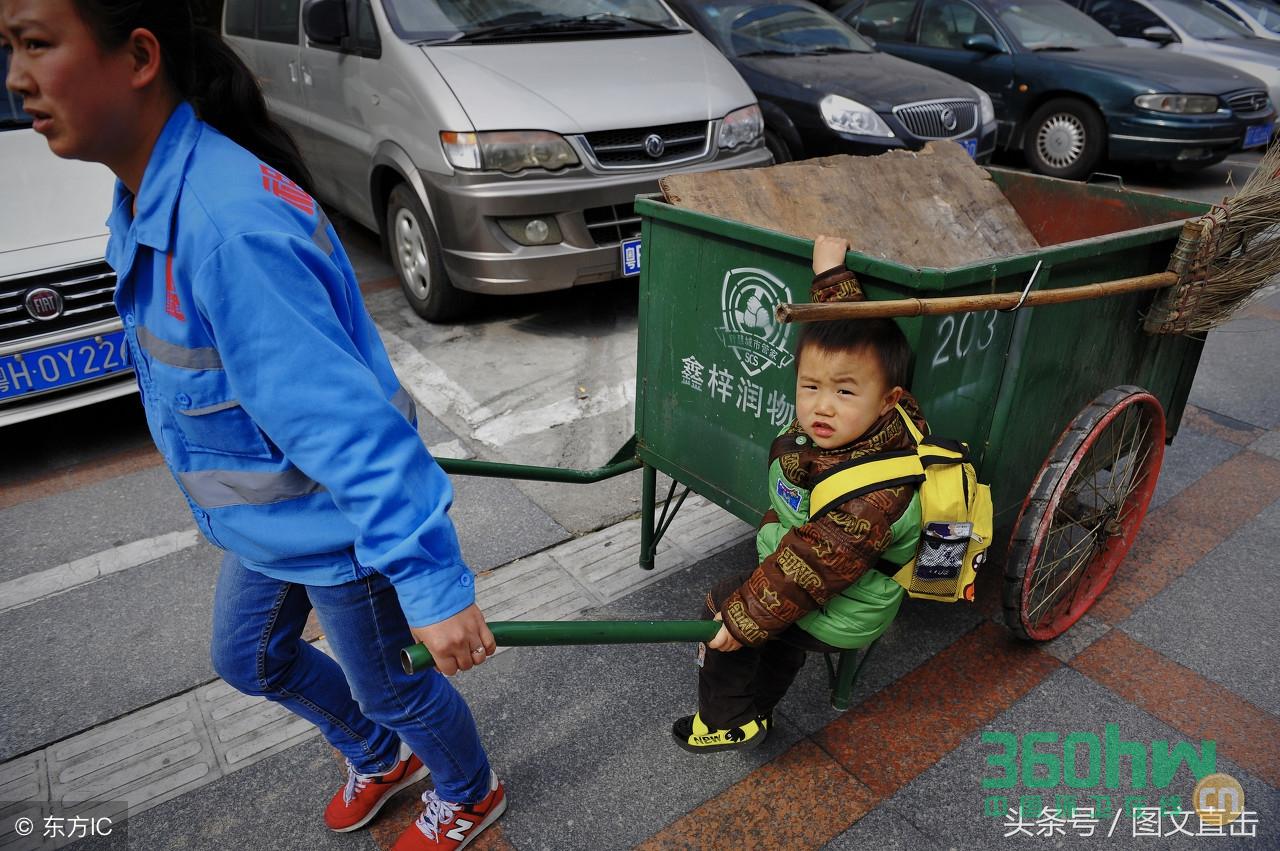 3/8對于環衛工,社會上給予了兩個稱呼,好聽的一個稱呼是“城市美容師”,但是對于環衛工不夠尊重的人卻稱之為“掃大街的”。這是一名來自農村的女環衛工在清掃街頭,由于孩子小沒有人帶,她只好帶著孩子一起勞動。兒子坐在垃圾車上很乖,有時懂事的兒子還會提出要幫媽媽拉車。