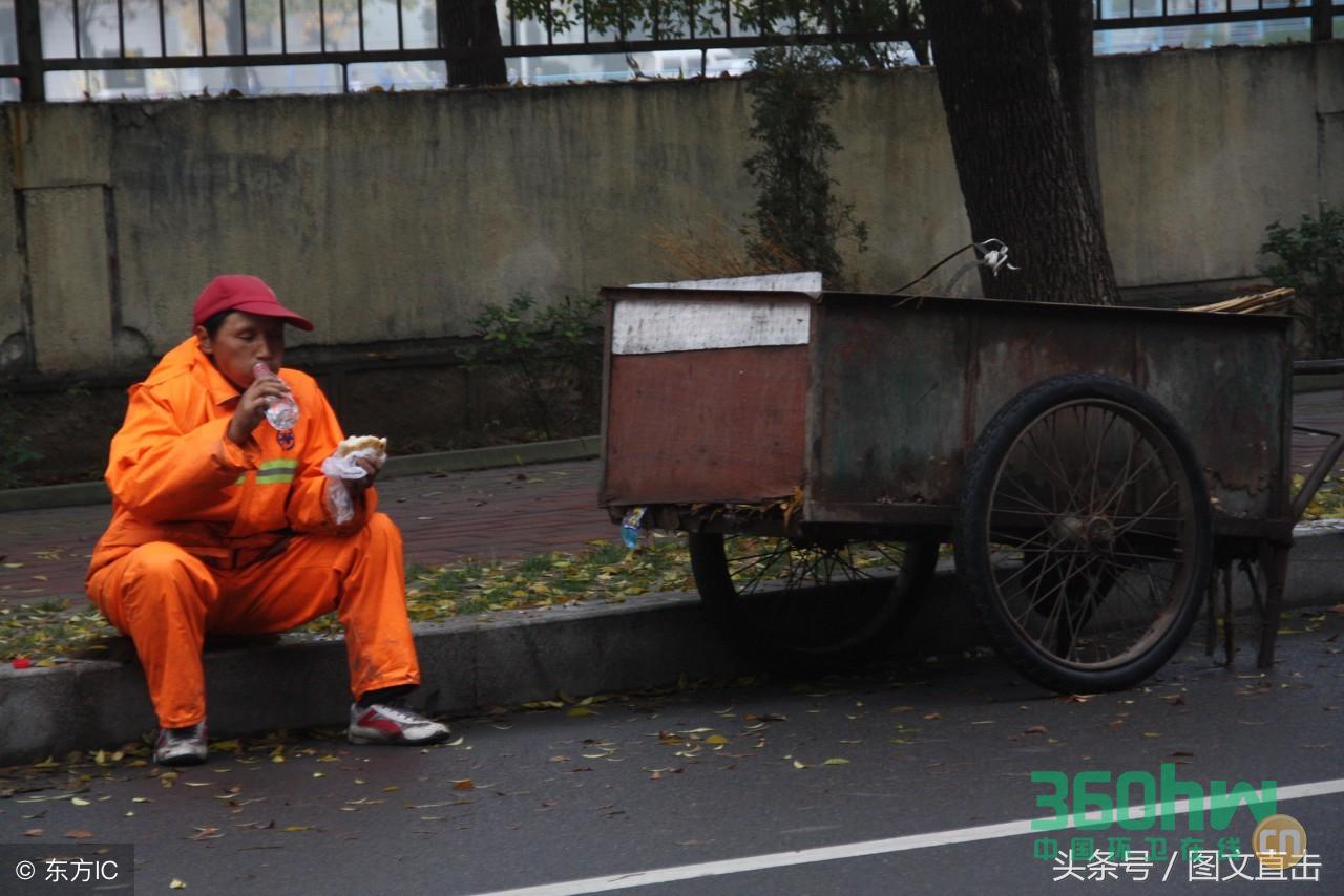 6/8為了維持城市的整潔,環衛工的工作時間很長,很多人是早上5點鐘起床一直要干到晚上10點鐘。所以風餐露宿是家常便飯。這是一位環衛工蹲坐在路邊吃飯的場景,一塊大餅加上一瓶水就足以應付一餐。