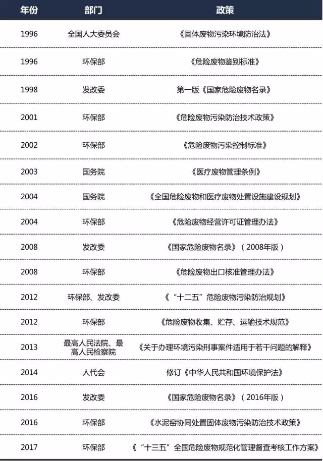 危廢政策不斷出臺,尤其是省級細則落地:1)2017年環保部出臺“十三五”全國危險廢物規范化管理督查考核工作方案,各省近期均推出省級危廢規范化管理督查方案;2)《國家危險廢物名錄》自2016年8月1日起施行;新修訂的《固體廢物污染環境防治法》取消危險廢物省內轉移審批手續;3)2016年最高司法機關就環境污染犯罪出臺專門司法解釋;4)2018年起實施《環境保護稅法》,危廢稅額1000元/噸;5)環保部發布《水泥窯協同處置固體廢物污染防治技術政策》,支持水泥窯協同處置。