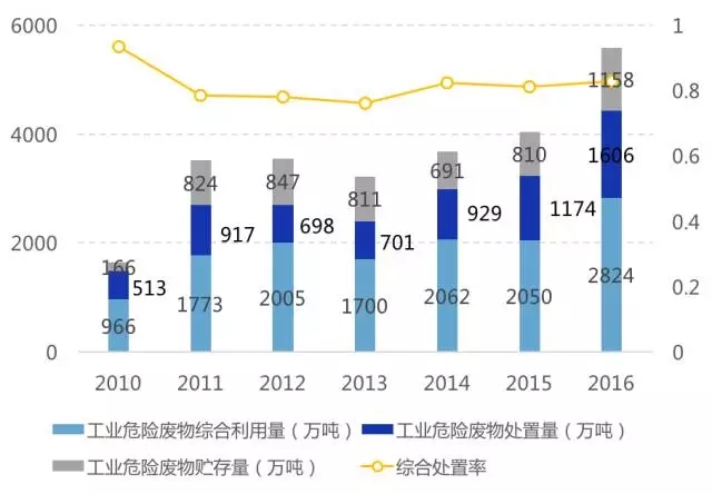 在環保監管力度增強,各省均推出省級督查方案背景下,危廢處置剛需再次提升,尤其是要求進入規范渠道處置的量增加。但市場情況是,實際產生量遠大于統計量(披露16年5347萬噸,預計實際8000萬噸),低綜合利用處置率(83%),低有效利用率(25%),導致整體危廢的處置供不應求。