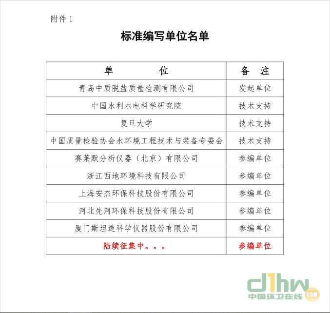 根據《關于批準<水利工程建設項目經理評價>等8項標準立項的通知》(中水企〔2018〕23號),由青島中質脫鹽質量檢測有限公司發起立項的《光譜法水質在線快速檢測系統》標準,經中國水利企業協會審查批準立項,我公司組織開展標準編制工作。為研究討論標準技術問題,確保標準編寫質量,定于2019年1月11日在上海召開標準討論會,請貴單位選派參與標準編寫的專家參加。現將相關事宜通知如下:一、會議時間2019年1月11日9:00-12:00開會(1月10日下午13:00-19:00報到)。二、參會人員主編單位和參編單位的標準編制相關負責人。三、會議內容(一)起草單位對標準編制情況進行匯報;(二)對標準初稿進行研究和討論;(三)提出下一步編制工作計劃和安排。四、會議地點上海江蘇飯店(地址:上海市武寧路888號,電話:021-62051888)五、注意事項(一) 為了便于標準編制工作開展和組織,請相關參編單位積極配合,提供相關人力、物力及資金支持,相關事宜請與我公司聯系。(二)食宿由組委會統一安排,住宿費用