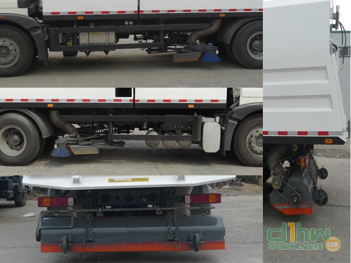 該車主要用于城市道路、廣場以及公園路面清掃;由封閉式車箱,風機、掃刷、吸盤等組成;側面防護裝置由工作裝置及部分護欄組成,側面防護裝置材料材質為Q235B,與車架采用螺栓連接,后部工作裝置與后下部防護裝置相干涉,故豁免,后部工作裝置行車時離地高:270mm;隨底盤裝配ABS,ABS型號: 4460046300,ABS生產廠家: 威伯科汽車控制系統(中國)有限公司。