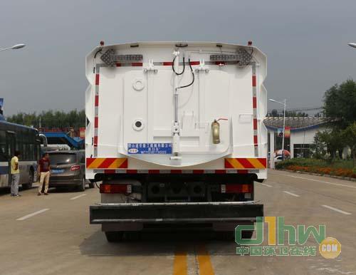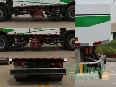 該車裝備有垃圾箱、水箱、洗掃刷等專用裝置,具有清掃和清洗功能;僅采用軸距為:5000mm,僅采用底盤鋼板彈簧片數為11/9+8,3/9+8,3/3+2;側后防護裝置材料均為:Q235,側后防護裝置與車架連接方式均為:螺栓連接,后防護裝置尺寸為:截面250X55mm,離地高度500mm;ABS系統型號為4460046300,生產企業為威伯科汽車控制系統(中國)有限公司.