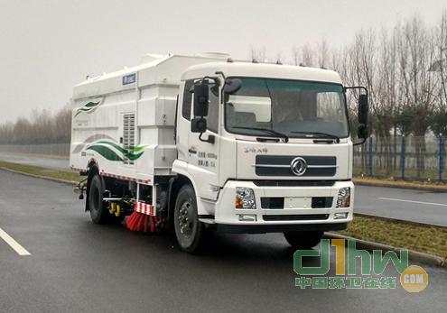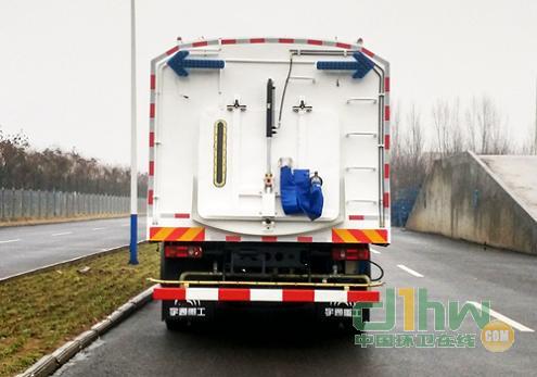 創新開發的一款集掃路車和高壓清洗車功能于一體的高效環衛設備。該車機動性能好,油耗低、噪聲小、效率高,深受廣大用戶青睞。特別適用于城市道路路面、道路側石上平面及立面的清洗,并且能回收清洗污水。它擁有多項專利,技術處于國內外領先地位。該車采用高壓力、低流量水流沖洗,并結合掃刷刷洗路面、吸嘴收集污水,實現了強力去污、高效節水、污物及污水回收的目的。作業時,外伸至道路側石的左(右)旋轉洗刷配合低壓水首先對路面、道路側石上平面及立面進行一次刷洗。同時緊隨其后的中置超寬吸嘴中的內置長排噴桿和左右兩側的旋轉噴桿的高壓水,對路面、道路側石上平面及立面進行第二次沖洗,兩側噴桿形成的“V”型工作夾角,使清洗后的污水自動流向中置超寬吸嘴,將污水匯集至吸嘴口、吸入污水箱。經過兩次清洗后的道路路面、道路側石上平面及立面可達到無垃圾、無灰塵、無污漬、無污水的效果,從而大大提高了城市道路的清潔質量