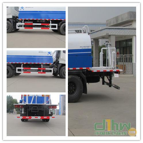 該車專用裝置為罐體、水泵,主要用于清洗路面,灑水降塵及園林綠化;隨底盤選裝駕駛室;運輸介質:水,密度1000千克/立方米,罐體有效容積為11.27立方米,罐體外形尺寸(長×長軸×短軸)為(mm): 5200×2200×1400;該車采用4700mm、4500mm軸距,軸距/后懸對應關系為;4700/2370,4500/2570;側面防護裝置采用Q235A,側防護為螺栓連接,后下部防護裝置材料為槽鋼,采用螺栓連接,后防護截面為120mm×53mm,離地高度450mm;ABS型號及廠家:3631010-C2000,4460046440;東科克諾爾商用車制動系統(十堰)有限公司,威伯科汽車控制系統(中國)有限公司.