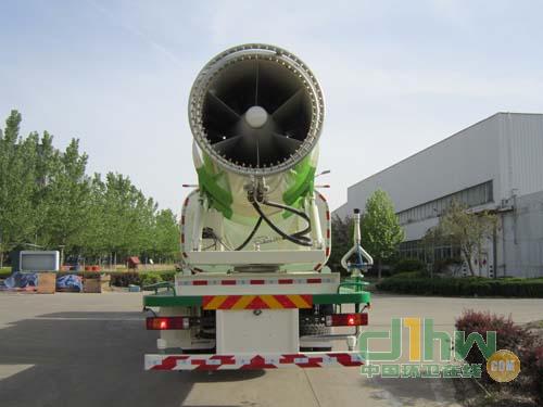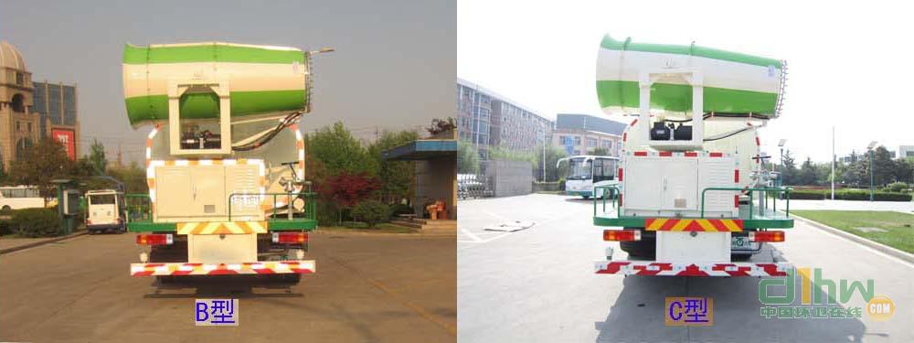 側防護及后防護材料Q235,側防護螺栓連接;后防護焊接,截面尺寸150X65mm,離地高度500mm.選裝三種噴霧機:A型整車長11650mm,高3890mm,后懸3230mm,后伸1040mm,整備質量16500kg,載質量8370kg;B型整車長10310mm,高3560mm,后懸2930mm,整備質量15380kg,載質量9490kg;C型整車長9780mm,高3560mm,后懸2400mm,整備質量14700kg,載質量10170kg.ABS系統型號為4460046300,生產企業為威伯科汽車控制系統(中國)有限公司。噴霧機采用廣東風華環保設備股份有限公司所研發生產的環保除塵風送噴霧機.專用裝置:風送式噴霧機,型號:3WD2000-120,3WD2000-100,3WD2000-80,生產廠家:廣東風華環保設備股份有限公司.