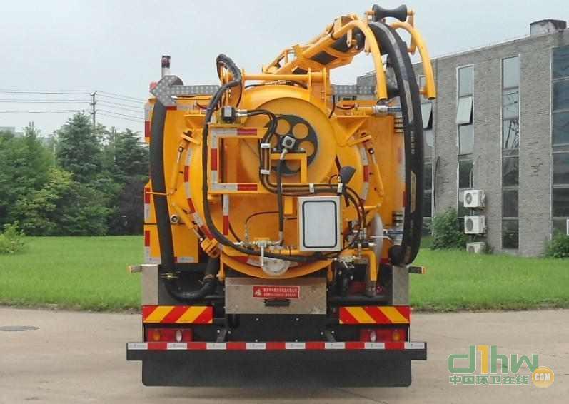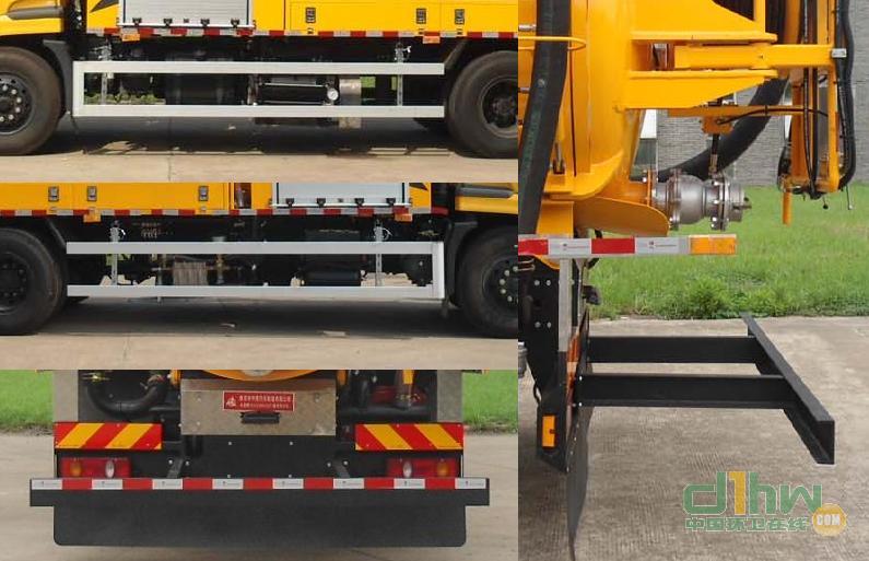 污水罐有效容積7.9立方米,罐體外形尺寸(直徑×直段長)(mm):1600×3600,選裝污水罐外形尺寸(直徑×直段長)(mm ):1700×3400,,運輸介質為液態污物,介質密度為800千克/立方米。水罐是由2個相同的梯形罐體組成,單個罐體外形尺寸(上底+下底)×高×長(mm):(767+563)×1255×2900,有效容積3.65立方米。清洗吸污兩種功能不同時使用,兩個罐體不能同時滿載。側面防護裝置材料:3A21,連接方式:橫豎桿之間螺栓連接,與車架之間螺栓連接。后下部防護裝置材料為:Q235-A,截面尺寸為:140×58(mm),僅選用軸距為4700mm和4500mm的底盤。主要專用裝置為真空抽吸及高壓清洗系統。隨底盤選裝駕駛室前臉擾流罩.選裝前霧燈.駕駛室頂部裝飾燈為選裝件.選裝臥鋪側窗裝飾板。選裝盤式吸污臂。