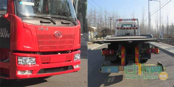 清障車托舉質量為:6350千克。隨底盤選裝2900mm高駕駛室。后防護因與托舉機構干涉豁免。側防護為裙邊結構截面高度為50×540mm,離地高度為410mm。與底盤為鉸鏈結構聯接,可翻轉開啟,側防護所用材質均為:Q235金屬材料。發動機凈功率值:BF4M2012-16E51發動機110kW,CA4DK1-18E51發動機136kW,CA4DH1-16E51發動機為118kW,VIN與發動機對應關系:LFNAFUJM對應BF4M2012-16E51,CA4DH1-16E51發動機5300mm軸距,LFNAFUKM對應CA4DK1-18E51發動機5300mm軸距,安裝ABS防抱死制動系統,生產廠家:長春科密汽車制動有限公司,型號:CM4XL,安裝具有衛星定位功能的行駛記錄。后部托板選裝折疊板。僅用9.00R20 16PR,10R22.5 16PR二款輪胎。隨底盤選裝新型前臉。