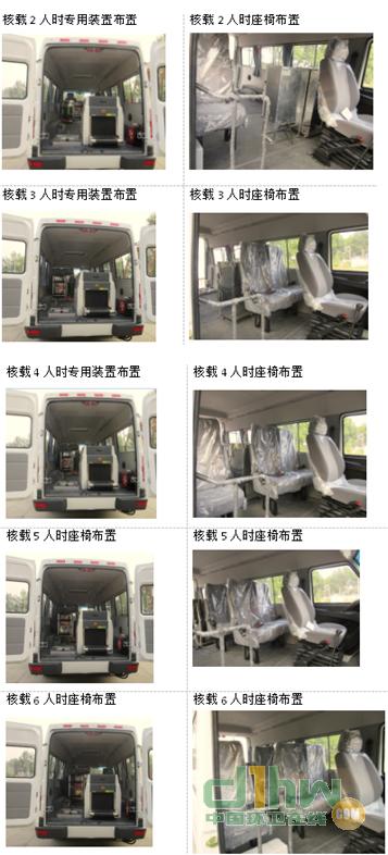 車輛用于有現場檢測需要的場所,如食品現場監督檢查或醫療現場應急化驗、快遞公司郵件安檢等場所。樣車在原整車基礎上拆掉部分坐椅,用于安裝檢測臺、冰箱、消毒柜、烘焙機、顯微鏡、X光機等檢測設施及安全檢測設施,樣車保留駕駛區座椅并選裝乘員區第一排或乘員區第一、第二排座椅,便于檢測人員2~6人乘坐。 隨底盤選裝前大燈、前保險杠、前格柵、前霧燈,選裝無前霧燈,選裝后保險杠、后霧燈、倒車燈、回復反射器,選裝前保險杠,選裝后保險杠,選裝尾部文字標識,選裝前保裝飾條,