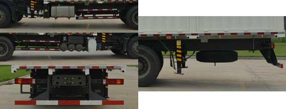 僅選用5800+1350mm軸距底盤;隨底盤選裝限速裝置時,最高車速為89km/h;僅選用鋼板彈簧懸架型式;可不選裝后風窗;選裝貨廂欄板結構。可選裝ST220直臂式隨車起重機,ST260和ST220隨車起重機可不選裝高空座椅操縱形式,可不選裝在隨車起重機轉臺布置液壓油箱形式。高空座椅和液壓油箱引起的質量變化在3%以內。駕駛室準乘人數為2人時,額定載質量9170kg;駕駛室準乘人數為3人時,額定載質量9105kg。隨車起重機型號/質量(kg)/最大起升載荷(kg)/對應關系為:ST260/4100/10000;ST220/4080/8000。選裝MC07.24-50和MC07.24-52發動機時油耗申報值為35.06L/100km;選裝MC07.28-50和MC07.28-52發動機時油耗申報值為35.11L/100km;選裝MC07.31-50和MC07.31-52發動機時油耗申報值為35.25L/100km;選裝MC07.34-50和MC07.34-52發動機時油耗申報值為35.45L/100km;選裝MC07.35-50發動機時油耗申報值為35.46L/100km。側面及后下部防護裝置所用材料材質為Q235A,連接方式為螺栓連接,后下部防護裝置的斷面尺寸為100mm×50mm,離地高度530mm。ABS系統型號為4460046300,生產企業為威伯科汽車控制系統(中國)有限公司。安裝具有衛星定位功能的行駛記錄儀。