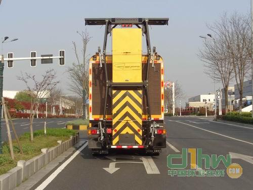 該車安裝有防撞緩沖專項作業裝置及導向標志顯示裝置(液晶顯示屏導向指示)。左右側防護對稱安裝,側防裝置材料為Q235A,與汽車大梁用螺栓連接。后防裝置材料為Q235A,后防護與專用裝置焊接連