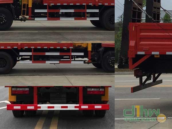 1,主要專用裝置為貨箱,吊機。直臂式吊機型號/吊機重量(kg)/最大起升載荷(kg)為:SQS200/3500/8000,QYS-8/3500/8000。2,僅采用軸距5100mm,5150mm。軸距/前懸/后懸對應關系為(mm):5100/1250,1450/2650,2450;5150/1250/1450/2600,2400。3,側,后防護材料均為冷彎型鋼Q235,側防護螺栓連接,后防護焊接,后防護截面尺寸120×50mm,離地高度450mm,安裝帶有衛星定位功能的行駛記錄儀。ABS型號/生產廠家為:ABS-E 4S/4M,3631010-C2000/生產廠為威伯科汽車控制系統(中國)有限公司,生產廠為東科克諾爾商用車制動系統(十堰)有限公司。采用的發動機與油耗值對應關系為(L/100Km):ISD18050/27.0,ISD210 50/27.0,ISD245 50/27.0,ISD270 50/27.0,ISB190 50/27.2,ISB210 50/27.2,YC6JA180-50/27.1,YC6JA220-50/27.1,YC6A240-50/27.1,EQH180-52/27.2。