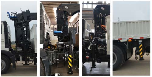 隨車起重機型號/質量(kg)/最大起升載荷(kg)對應關系為:ST220/4080/8000;ST170/2450/6300。選裝ST220隨車起重機時,整備質量(Kg)/整車高度(mm)/貨箱欄板內尺寸長度(mm)對應關系為:12050/3530/5610,5530;選裝ST170隨車起重機時,整備質量(Kg)/整車高度(mm)/貨箱欄板內尺寸長度(mm)對應關系為:10960/3460/5850。隨底盤選裝駕駛室樣式,選裝起重機高位,中位,地面操縱方式及后支腿,選裝引起的質量變化在3%以內。側面及后下部防護裝置材料為Q235A,均為螺栓連接,后下部防護裝置斷面尺寸為100mm×100mm,離地高度為500mm。該車選裝的發動機油耗申報值均為29.5L/100Km。ABS型號為4460046300,生產廠家為威伯科汽車控制系統(中國)有限公司。安裝帶衛星定位功能的行駛記錄儀。
