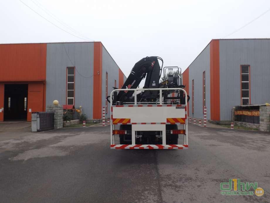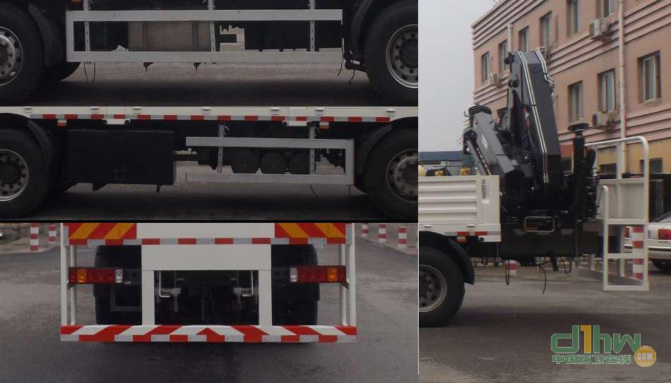 隨底盤選裝駕駛室。該車側防護裝置所用材料為鋁材質,與車架螺栓連接。后下部防護裝置所用材料為Q235,與車架焊接固定,截面尺寸為:120×60×2400(mm),離地高480mm。ABS系統型號為4460046300,生產企業為威伯科汽車控制系統(中國)有限公司。選裝起重機型號,最大起重載荷,自重分別為PK(SPK)12000,6500kg,2500kg;PK(SPK)15500,6600kg,2550kg;PK(SPK)23500,6900kg,2600kg;HIAB111,6600kg,2350kg;HIAB178,6600kg,2350kg;HIAB288,6900kg,2450kg;HIAB 244,6800kg,2550kg;SQZ-6.3(QYS-6.3Z),6100kg,2430kg;SQZ-8(QYS-8Z),7000kg,2550kg;SQZ-12(QYS-12Z),7000kg,2600kg;HB120(HV147),6400kg,2250kg;HB150(HV197),6600kg,2450kg;HB250,6800kg,2650kg。起重機型號變化引起的質量變化在3%以內。后平臺選裝不加裝爬梯過道。
