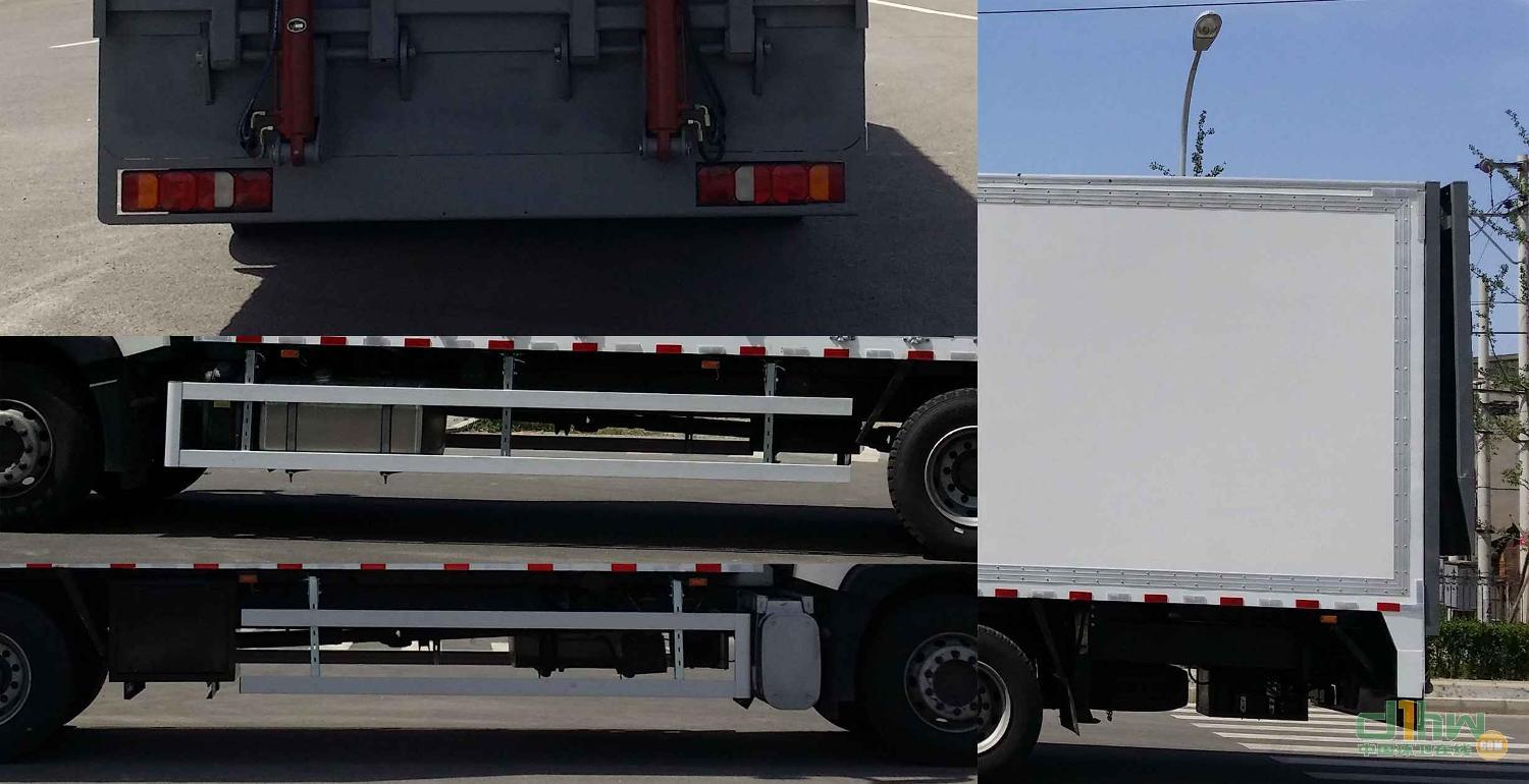 廂體頂部封閉,不可開啟.隨底盤選裝駕駛室,廂體選裝平板結構。側后防護裝置材料為Q235,側防護采用螺栓緊固于副梁上,后防護采用螺栓緊固于縱梁上,車廂后部為折疊液壓尾板,后防護由液壓尾板代替,離地高度500mm。選裝側圍板代替側防護。ABS系統型號為4460046300,生產企業為威伯科汽車控制系統(中國)有限公司。隨底盤選裝軸距,對應關系為:11790=1430+5800+1350+3210,11790=1430+5775+1400+3185,11190=1430+5200+1350+3210,11190=1430+5175+1400+3185。該車用于計量衡器的檢測,車內裝配形狀不同,質量相等的砝碼。專用裝置為液壓尾板。液壓尾板收起時水平長度310mm,計入整車長度。