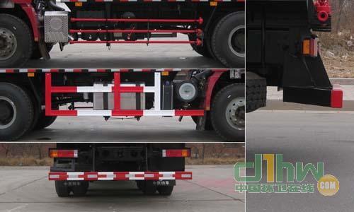 油田專用作業車,由三缸柱塞泵、車載特種鍋爐等組成,用于油田洗井靖蠟作業。可選裝功能參數相同的XJⅡ或XJⅢ三缸柱塞泵,裝XJⅡ泵時總質量21490、軸荷5180/8155/8155、整備質量21360;裝XJⅢ泵時總質量20730、軸荷4960/7885/7885、整備質量20600。可選裝983D,TM1200-1,DMCT1000三種反光標識和選裝DA-32a、DA-32b和VCDM-3兩種后尾部標志板,選裝時固定位置相同,對外形無影響。僅用軸距(mm):4450+1450。右側面及后下部防護裝置材質為Q235A,均為螺栓連接,后下部防護截面為矩形,截面尺寸(mm):120×53,離地高度:500mm。ABS生產廠家:東科克諾爾商用車制動系統(十堰)有限公司,ABS型號:3550D-1010。