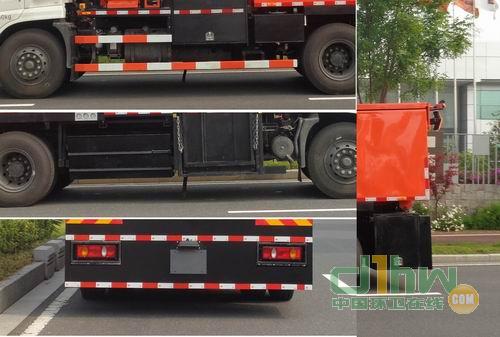 該車為瀝青路面養護專用作業車,前部懸掛安裝有壓路機,前伸830mm,整車總長8800mm,整備質量為12900kg。選裝前部無懸掛安裝壓路機,整車總長7720mm,整備質量以12100kg。側防裝置材料為Q235A,與汽車大梁用螺栓連接。后防護為l車身結構代替,與車身焊接為一個整體,材料Q235A,后部離地高320mm。 該車僅選用軸距4500mm底盤。隨底盤裝備ABS系統,ABS生產廠家:東風電子科技股份有限公司制動系統公司,型號:3631010-C2000。隨底盤駕駛室選裝前霧燈,駕駛室頂部裝飾燈為選裝件。