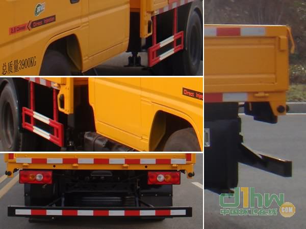 隨底盤選裝駕駛室;側面防護及后下部防護裝置材料材質:Q235,連接方式:焊接加螺栓連接;后下部防護裝置斷面尺寸(寬×高):50×100(mm),離地高度:400mm.ABS系統型號:APG3550500A,ABS系統生產廠家:浙江亞太機電股份有限公司.
