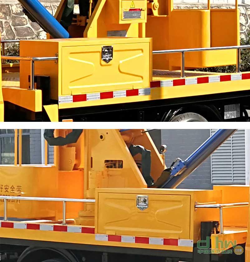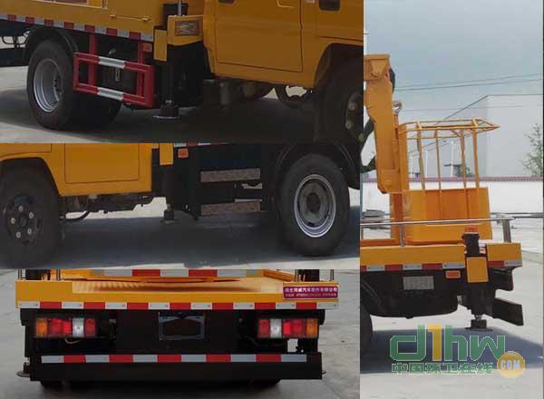 前伸200mm。側/后防護裝置材料材質為Q235,側防護螺栓連接,后防護焊接,截面尺寸(寬×高)mm:50×200,離地高450mm。ABS系統型號:APG3550500A,ABS系統生產廠家:浙江亞太機電股份有限公司。高空作業車:該車用途為搶修電力,通訊,路燈等高空作業。主要裝置為升降平臺,作業臂。隨底盤選裝駕駛室,選裝左、右工具箱。